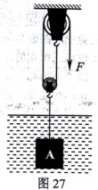 如图27所示,用滑轮组提升始终浸没在水中的物体A。已知定滑轮重4N,动滑轮重3N。物体A重8N,在拉力F=5N的作用下,物体A在水
