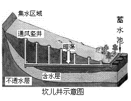 坎儿井是当地独具特色的灌溉用水利工程,其结构大体上是由竖井、地下渠道、地面渠道和“涝坝”(小型蓄水池)四部分组成。(左下图)