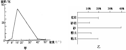 滑坡是我国山区常发生的一种地质灾害。下图中的甲为某滑坡区域坡度面积频率分布图,乙为某滑坡区域土质分布图。读图回答:
