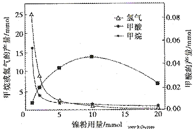 反应结束后,气体中检测到CH4和H2,滤液中检测到HCOOH,固体中检测到镍粉和Fe3O4。CH4.HCOOH.H2的产量和镍粉用量的关系如下图所示(仅改变镍粉用量,其他条件不变):
