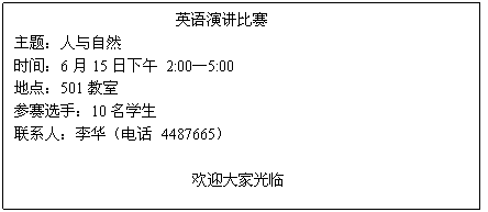 假设你是育才中学学生会主席李华,你校将举办一次英语演讲比赛(speech contest),希望附近某大学的外籍教师Smith 女士来做评委,请参照以下比赛通知给她写一份信,