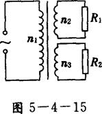 17.有一理想变压器,原线圈有440匝,副线圈有两个,它们的匝数分别是20匝和30匝,如图5-4-15所示,若原线圈接在220 V的电源上,副线圈竹n2的负载电阻R1为5.0
