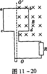 如图11-20所示,边长为L的正方形线圈abcd的匝数为n,线圈电阻为r,外电路的电阻为R,ab的中点和cd的中点的连线O0′恰好位于匀强磁场的边界上,磁感应强度为B,现在线圈以O0′为轴,以角速度