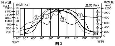 2.读图2判断反映全球年降水量随纬度分布的曲线是![]()