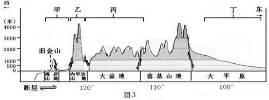 图3为“某大陆沿北纬38°线地形剖面图”,读图回答3、4题。
