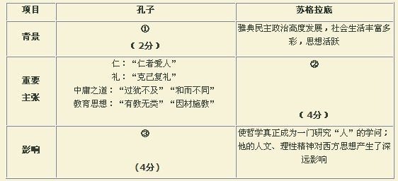 (1)为更好地理解东西方文化的特点,某同学设计了如下表格,请帮助完成下表的空白部分。(10分)