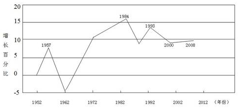 (3)上图反映出新中国成立以来我国GDP增长率的发展变化,并分别在1957年、1984年和1993年出现了三个峰值,请概括指出这些峰值出现的关键因素。(9分)