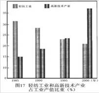 读图17“珠江三角洲地区轻纺工业和高新技术产业占工业产值的比重图”,回答:
