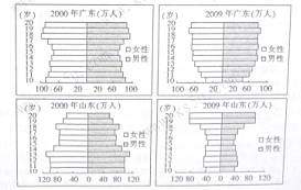 18~20岁是高考适龄人口。读广东省和山东省2000年和2009年l0岁至20岁的人口金字塔图,回答第3题。