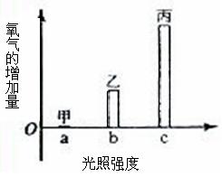 取某种植物生长状态一致的新鲜叶片,用打孔器打出若干圆片,圆片平均分成甲、乙、丙三组,每组各置于一个密闭装置内,并分别给予a、b、c三种不同强度的光照,其他条件一致。照光相同时间后,测得各装置内氧气的增加量如图所示,下列叙述错误的是( )
