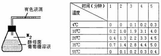 38. 下图是某同学为了研究酵母菌的无氧呼吸所制作的一个实验装置。开始时锥形瓶中装有质量分数为2%的葡萄糖溶液,并在其中加入适量的酵母菌。实验过程中,刻度玻璃管中的有色液滴会向右移动。表中是该同学在不同的温度条件下进行实验时所记录的液滴右移的距离(单位:cm)。请判断下列有关叙述不正确的是( )