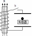 21、如图所示,两块水平放置的金属板距离为d,用导线、电键K与一个n匝的线圈连接,线圈置于方向竖直向上的均匀变化的磁场B中.两板间放一台小压力传感器,压力传感器上表面绝缘,在其上表面静止放置一个质量为m、电量为+q的小球.K断开时传感器上有示数,K闭合时传感器上的示数变为原来的一半.则线圈中磁场B的变化情况和磁通量变化率