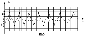 7、.某同学在实验室里熟悉各种仪器的使用,他将一条形磁铁放在转盘上,如图甲所示,磁铁可随转盘转动,另将一磁感强度传感器固定在转盘旁边,当转盘(及磁铁)转动时,引起磁感强度测量值周期性地变化,该变化与转盘转动的周期一致.经过操作,该同学在计算机上得到了如图乙所示的图像: