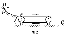 如图8所示,在竖直平面有一个光滑的圆弧轨道MN,其下端(即N端)与表面粗糙的水平传送带左端相切,轨道N端与传送带左端的距离可忽略不计。当传送带不动时,将一质量为m的小物块(可视为质点)从光滑轨道上的P位置由静止释放,小物块以速度v1滑上传送带,从它到达传送带左端开始计时,经过时间t1,小物块落到水平地面的Q点;若传送带以恒定速率v2沿顺时针方向运行,仍将小物块从光滑轨道上的P位置由静止释放,同样从小物块到达传送带左端开始计时,经过时间t2,小物块落至水平地面。关于小物块上述的运动,下列说法中正确的是