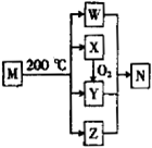 (4)M、N都是由A、B、C、D四种元素组成的酸式盐。M加热到200℃时会分解为物质的量相等的W、X、Y、Z四种气体,其中X、Y的组成元素相同。它们有如图所示的转化关系。