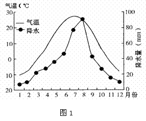 图1是“我国自然地理分界线上某地的气候资料示意图”,读图判断1-2题。