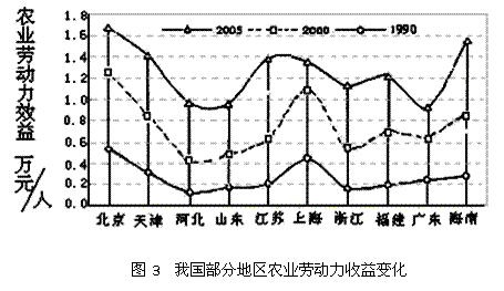 当今社会农业劳动力向非农就业转移的速度较耕地面积减少的速度越快,农业劳动力效益增幅就越高,反之则低。据此读图3回答6-7题。