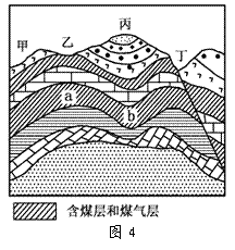 2009年11月21日,黑龙江省鹤岗市新兴煤矿发生特大矿难,共造成108名矿工死亡。读某地地质构造剖面图(图4),回答8-9题