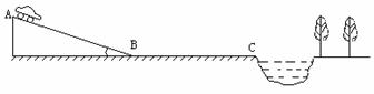 (11分)一小轿车从高为10m、倾角为37°的斜坡顶端从静止开始向下行驶,当小轿车到达底端时进入一水平面,在距斜坡底端115m的地方有一池塘,发动机在斜坡上产生的牵引力为2×103N,在水平地面上调节油门后,发动机产生的牵引力为1.4×104N,小轿车的质量为2吨,小轿车与斜坡及水平地面间的动