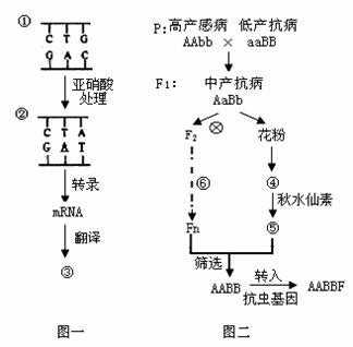 (2)图二中控制小麦产量(A、a)和抗病与感病(B、b)的两对等位基因分别位于两对同源染色体上。F2的表现型有 ▲ 种。F2中高产抗病植株占 ▲ 。鉴别高产抗病植株是否为纯合子的最简便方法是: ▲ 。在