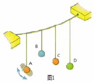 如图1所示,在张紧的绳上挂了A、B、C、D四个单摆,A摆与C摆的摆长相等,D摆的摆长最长,B摆最短。先将A摆拉离平衡位置后释放(摆角不超过5°),则下列说法中正确的是: