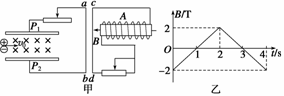 21.离子气流由左方连续以v0射入Pl和P2两板间的匀强磁场中,ab直导线与Pl、P2相连接,线圈A与直导线cd连接.线圈A 内有随图乙所示的变化磁场.且磁场B 的正方向规定为向左,如图甲所示,则下列叙述正确的是 ( )