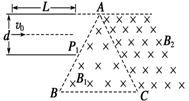 ×104V的电压,上板电势高;现从左端沿中心轴线方向入射一个重力不计的带电微粒,微粒质量m=10-10kg,带电量q=+10-4C,初速度v0=105m/s;中间用虚线框表示的正三角形内存在垂直纸面向里的匀强磁场B1,三角形的上顶点A与上金属板平齐,BC边与金属板平行,AB边的中点P1恰好在下金属板的右端点,三角形区域的右侧也存在垂直纸面向里,范围足够大的匀强磁场B2,且B2=4B1。求: