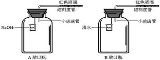 步骤三:将A、B两组小鼠分别放入A、B两瓶中,待小鼠安静后塞紧胶塞,一段时间后记录两装置中液滴的移动情况。