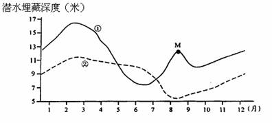 下面是我国两地潜水埋藏深度年变化曲线图,读图回答3--4题。