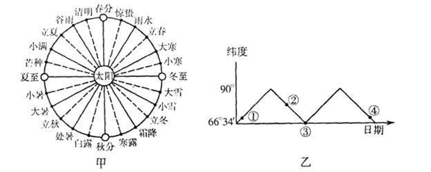 8.图乙是北半球晨昏线与纬线的切点变化示意图,图中四点的日期所处的节气正确的是 ( )