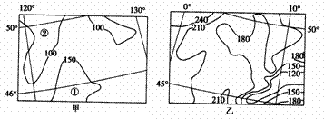 4.甲图中①、②两地无霜期差值T范围是