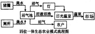 安徽省某镇是“蓝田花猪”的产地,当地政府积极推广使用“日光温室、猪圈、厕所和沼气池”四位一体的生态农业模式,取得了良好的经济效益和生态效益。读下图回答10-11题。