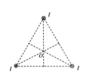 三根相互平行的通电长直导线放在等边三角形的三个顶点上,右图为其截面图,电流方向如图所示。若每根导线的电流均为I,每根直导线单独存在时,在三角形中心O点产生的磁感应强度大小都是B,则三根导线同时存在时O点的磁感应强度大小为( )