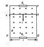 22.(共16分)如图所示,MN和PQ为竖直方向的两平行长直金属导轨,间距l为0.40m,电阻不计. 导轨所在平面与磁感庆强度B=5.0T的匀强磁场垂直。质量m=6.0×10-2kg、电阻r=0.5Ω的金属杆ab始终垂直于导轨,并与其保持光滑接触。导轨两端分别接有阻值均为3.0Ω的电阻R1和R2。重力加速度取10m/s2,且导轨足够长,若使金属杆ab从静止开始下滑,求: