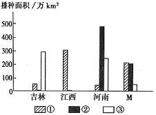 下图显示我国四个省2004年三种谷物的种植面积。读图,回答6-7题。