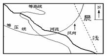 下图为“中纬度某地某日河流、风向、等压线、等高线、晨线的组合图”,读后回答17-18题。