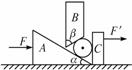 有一种机械装置,叫做“滚珠式力放大器”,其原理如图所示,斜面A可以在水平面上滑动,斜面B以及物块C都是被固定的,它们均由钢材制成,钢珠D置于A、B、C之间,当用水平力F推斜面A时,钢珠D对物块C的挤压力F′就会大于F,故称为“滚珠式力放大器” .如果斜面A、B的倾角分别为α、β,不计一切摩擦力以及钢珠D自身的重力,这一装置的力放大倍数(即F′与F之比)为( )