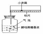 22.下图是用来研究温度对酵母菌酒精发酵影响的装置。广口瓶内装有酵母蔗糖溶液,实验记录的是玻璃管中小液滴移动的距离(单位:cm),结果见下表。依据该实验装置和实验数据判断,下列说法正确的是
