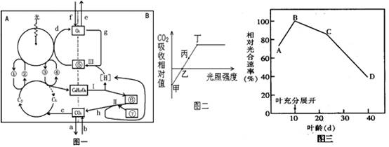 28.(8分)图一表示发生在高等植物叶肉细胞内的A、B两项生理作用及相互关系的图解,其中①-⑥代表物质,abcdefgh表示生理过程,I-Ⅲ代表B生理作用的反应阶段;图二表示在适宜温度条件下该叶片CO2吸收量随光照强度的变化曲线;图三表示绿色植物鸭茅(幼叶成折叠状)相对光合速率(%)与叶龄的关系。请据图分析回答: