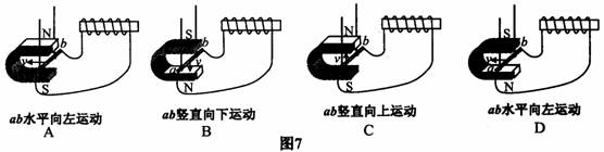 如图6所示,在蹄形磁体的磁场中放置一根与螺线管连