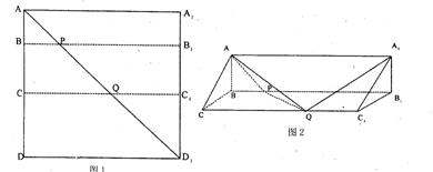 如图1所示,在边长为12的正方形ADD1A1中,点B、C在线段AD上,且AB=3,BC=4,作BB1//AA1,分别交A1D1,AD1于点B1,P,作CC1//AA1,分别交A1D1,AD1于点C1,Q,将该正方形沿BB1,CC1折叠,使得DD1与AA1重合,构成如图2所示的三棱柱ABC-A1B1C1。
