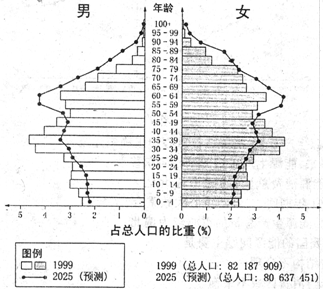 1999年该国0-14岁的人口占总人口的比例大约是 ( )