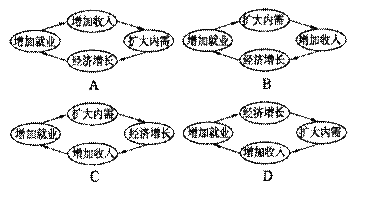 52.就业是民生之本。从经济上说,增加就业不但可以充分利用我国丰富的劳动力资源,而且还能促进经济良性循环。正确表示这种循环过程的是