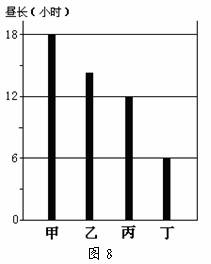 图8为同一日期甲、乙、丙、丁四个地点的昼长状况,据此回答16-18题。