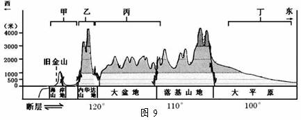 图3为“某大陆沿北纬38°线地形剖面图”,读图回答19-20题。