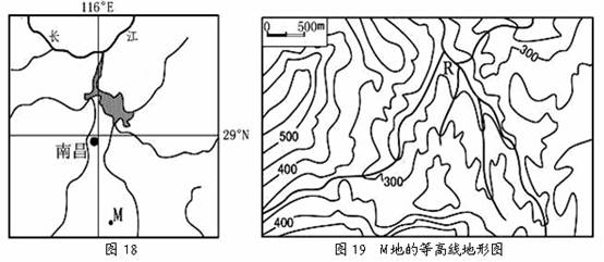 30.图18为我国某区域的水系分布示意图。某学校研究性学习小组对图18中的M地进行实地考察,并查阅了相关资料,发现近三十年来M地生态环境明显改善。图19为M地的等高线分布图,表1为M地的土地利用结构变化表。根据图表回答问题