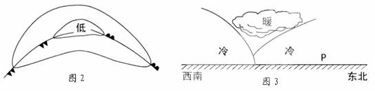 在锋面气旋中,由于冷锋的移动速度较快,冷锋追上暖锋而形成的天气系统称为锢囚锋,读下面锋面气旋(图2)与锢囚锋的剖面(图3)示意图,回答3-4题。
