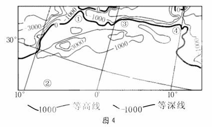 5.图中①地的自然带为 A.热带草原带 B.热带荒漠带 C.亚热带常绿硬叶林带 D.温带落叶阔叶林带 6.图4 ①-④地中,从自然因素考虑,最适合修建太阳能电站的是