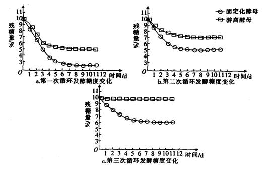 32.(7分)某实验小组开展对固定化酵母与游离酵母发酵性能比较的研究,在相同的发酵条件下,固定化酵母与游离酵母3次循环发酵的糖度变化曲线如下图。请分析回答:
