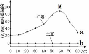 33.(10分)红薯和土豆都富含淀粉,但红薯吃起来比土豆甜。为探究其原因,某兴趣小组在不同温度、其它条件相同的情况下对处于休眠期的红薯块根与土豆块茎处理30分钟后测定还原糖的含量,结果如下图: